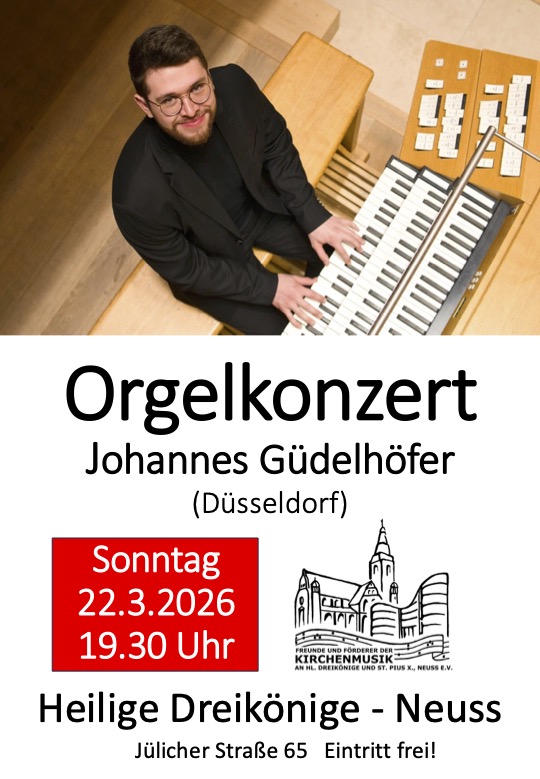 Herzliche EInladung zum Orgelkonzert mit Johannes Güdelhöfer (St. Lambertus, Düsseldorf) an der Walcker-/Klais-Orgel der Dreikönigenkirche. Es erklingen Orgelwerke u.a. von Johann Sebastian Bach und Julius Reubke (94. Psalm).